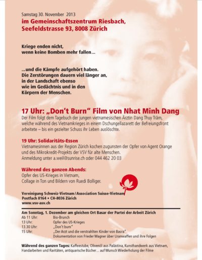 Home » Aktivitäten » Solidarität-fest » Solidaritätsfest 2013 Solidaritätfest 2013 Der Vereinigung Schweiz-Vietnam organisiert…SOLIDARITÄTSABENDSamstag, 30.11.2013, ab 17 Uhrim Gemeinschaftszentrum Riesbach, ZürichSeefeldstrasse 93, 8008 Zürich (Tram 2 oder 4 bis Haltstelle Feldeggstrasse oder Höschgasse)